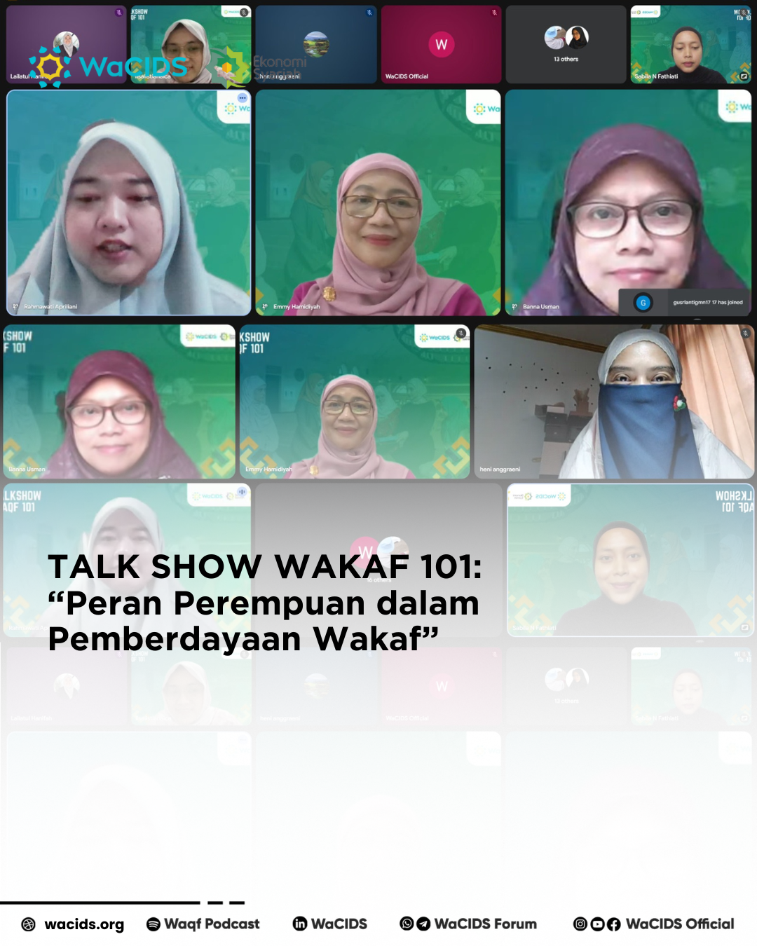 WaCIDS sejak awal berdiri berkomitmen untuk menjadikan wakaf sebagai instrumen pembangunan yang inklusif dan berkelanjutan. Perempuan adalah kunci dalam ekosistem ini, karena mereka bukan hanya sebagai wakif, tetapi juga potensial menjadi nazhir yang kompeten dan visioner. Harapan kami, forum ini dapat mendorong lahirnya kolaborasi baru dan meningkatkan literasi wakaf di kalangan masyarakat luas. Talk Show Wakaf 101 ini menjadi bagian dari komitmen WaCIDS dalam menghadirkan literasi, kolaborasi, dan inovasi untuk pengembangan wakaf di Indonesia. Dengan melibatkan perempuan secara aktif, WaCIDS percaya bahwa wakaf dapat menjadi instrumen strategis dalam membangun peradaban bangsa.